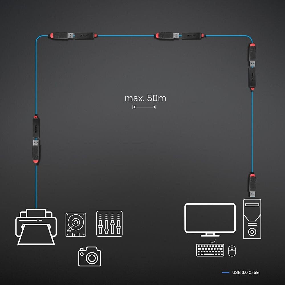 The Lindy USB 3.0 Active Extension Cable uses built-in active electronics to extend the cable length of a USB 3.0 device by an additional 3m whilst continuing to support data transfer rates of up to 5Gbps. With its USB A male and USB A female connector it allows Type A devices such as storage devices, webcams and other Type A devices to be connected at longer distances to PCs, laptops and tablets, while also ensuring flexible positioning.