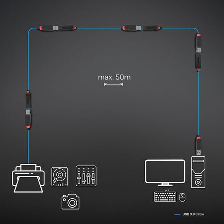 Up to 5 of these USB 3.0 Active Extensions Slim can be chained together. In addition, a maximum of 5 of the different cable lengths of these USB 3.0 Active Extensions Slim can be combined with each other. The only exception is the 15m version No. 43404: as it has 2 chipsets, a maximum of 3 other USB 3.0 Active Extensions Slim can be combined with it.
