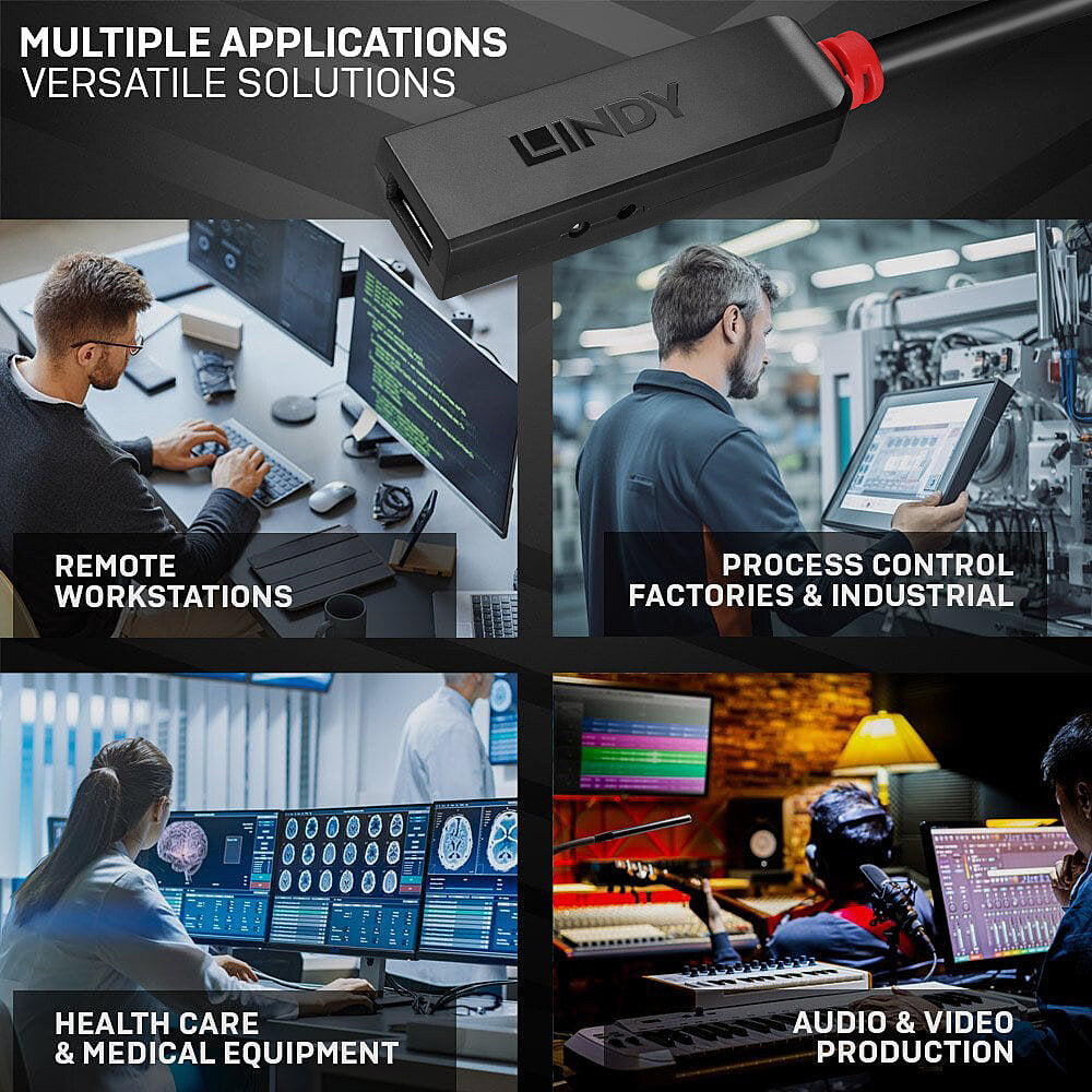 The Lindy USB 3.0 Active Extension Slim is supplied with power via the USB bus, but also has a DC socket for connecting a power supply unit for devices with high power requirements or if you want to connect several cables in series.
