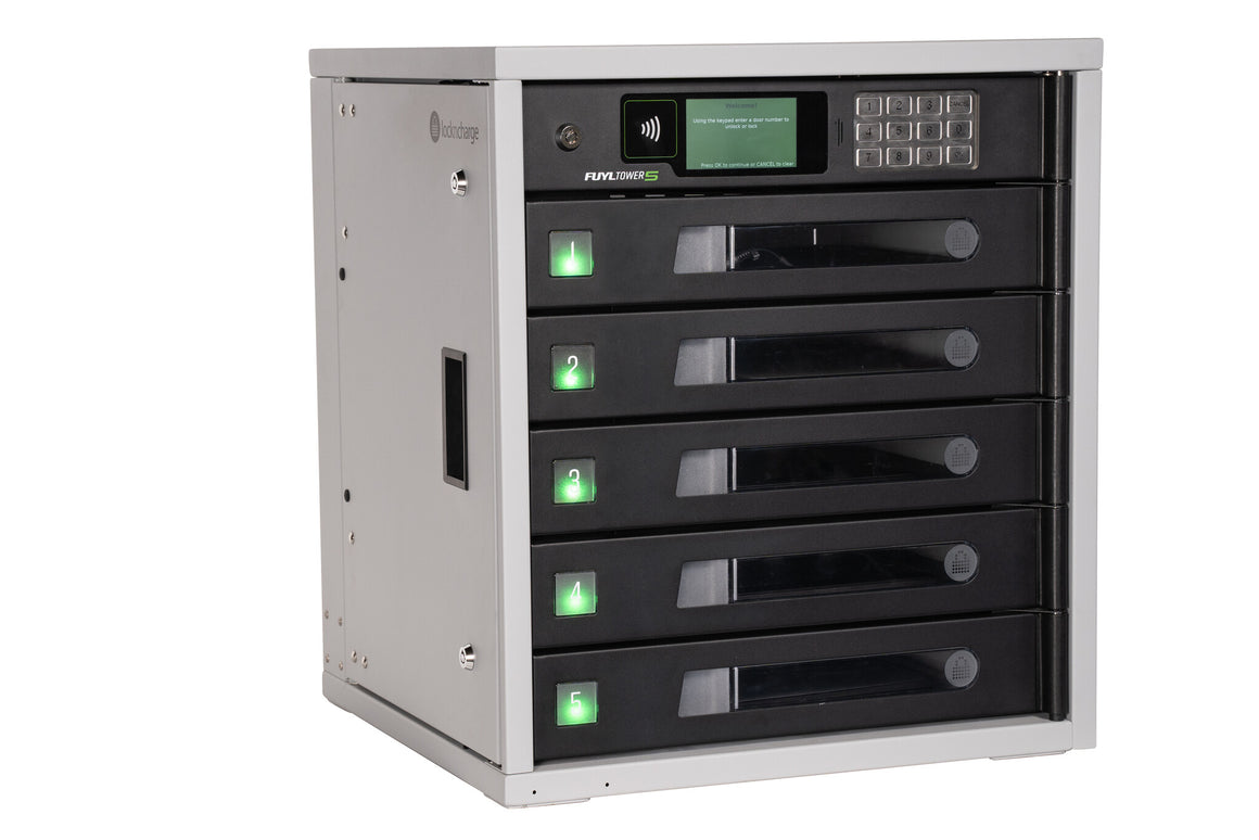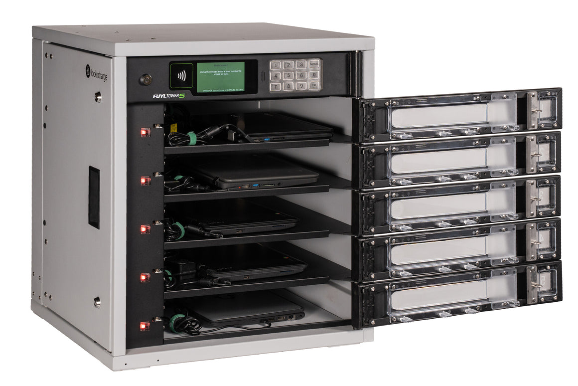 Intelligent Asset Management System that charges, stores, secures and manages assets for most mobile devices in 5 or 15 individually lockable compartments.