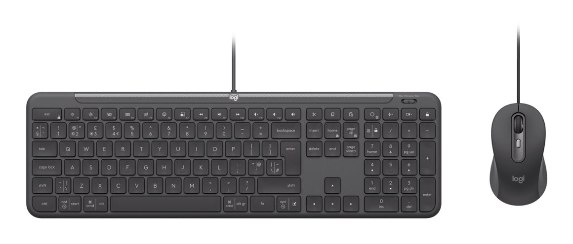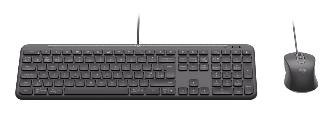 Multi-OS USB-C keyboard and mouse combo with laptop-style typing and ambidextrous mouse for workplaces that require wired connectivity.