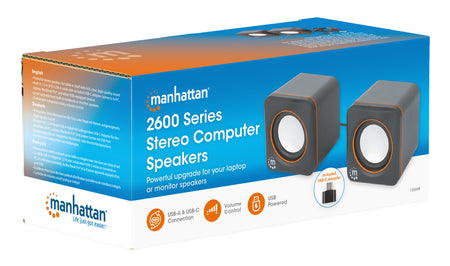 Improve your audio setup with the Manhattan 2600 Series Stereo Computer Speakers, designed to deliver rich, clear, and high-quality sound whether placed on a table or shelf. These powerful stereo speakers are the perfect upgrade from built-in notebook or monitor speakers, offering a superior listening experience for music, gaming, movies, and more.