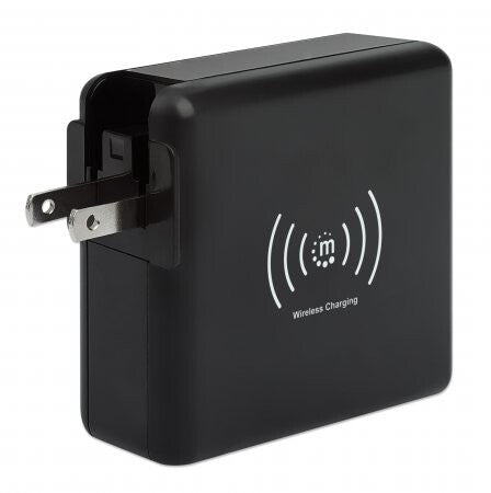 Manhattan 4-in-1 Travel Wall Charger and Powerbank 8,000 mAh, USA/UK/Euro 2-pin Plugs, Output: 1x USB-C, 2x USB-A ports and Wireless Charging Pad (5W), Black, One Year Warranty