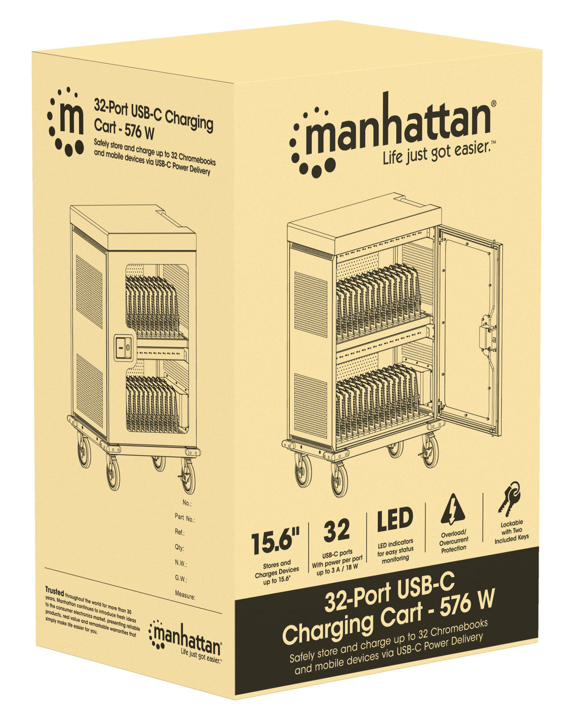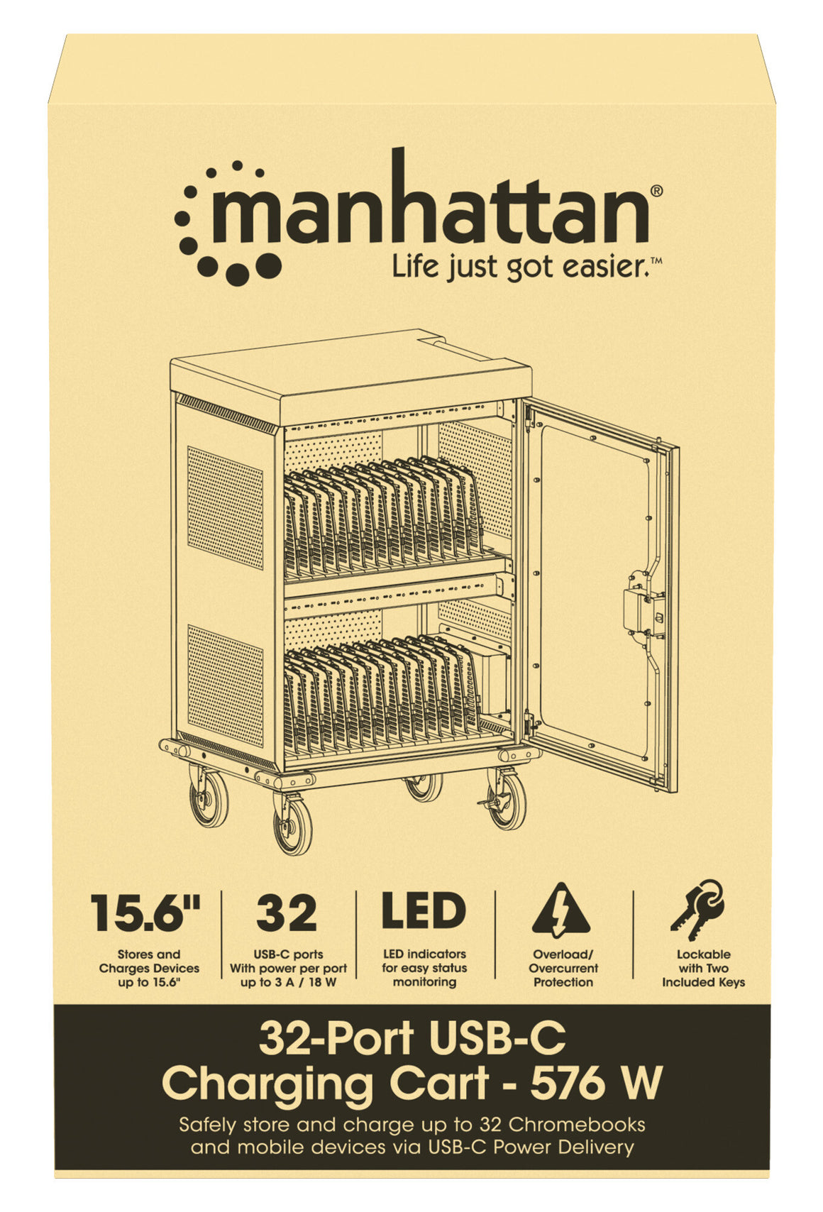 Visitors, guests and employees bring their mobile devices to all sorts of venues. Give your patrons a way to charge the drained batteries of their Chromebooks, smartphones or tablets with the Manhattan 32-Port USB-C Charging Cart - 576 W. It's the ideal solution for storing and charging portable electronic devices in restaurants, schools, gyms, doctor’s offices, universities, hotels, car rental agencies and more.