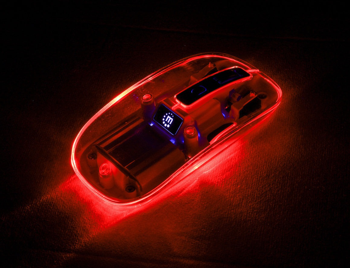 The Manhattan Transparent Wireless Optical USB Mouse is your attractive blend of style and functionality. Its transparent shell on a sleek silhouette showcases its components while the logo changes its colors in dynamic RGB light. The optical sensor immerses the mouse’s entire edge in a stylish red.