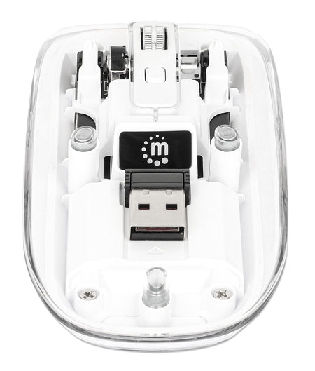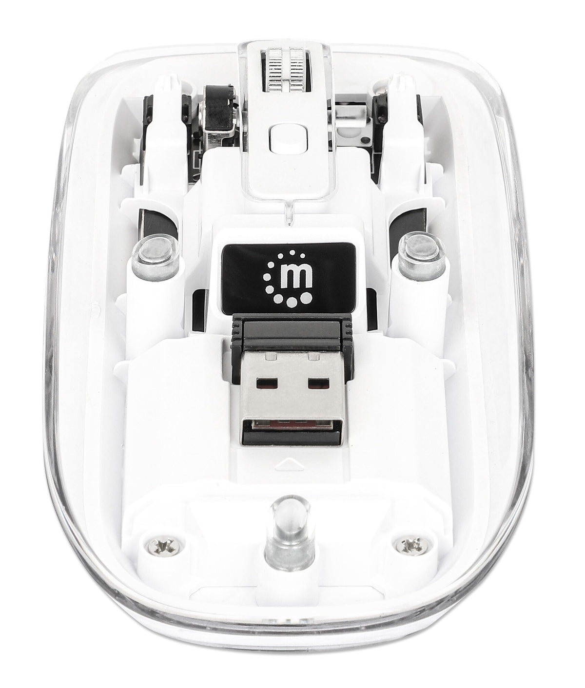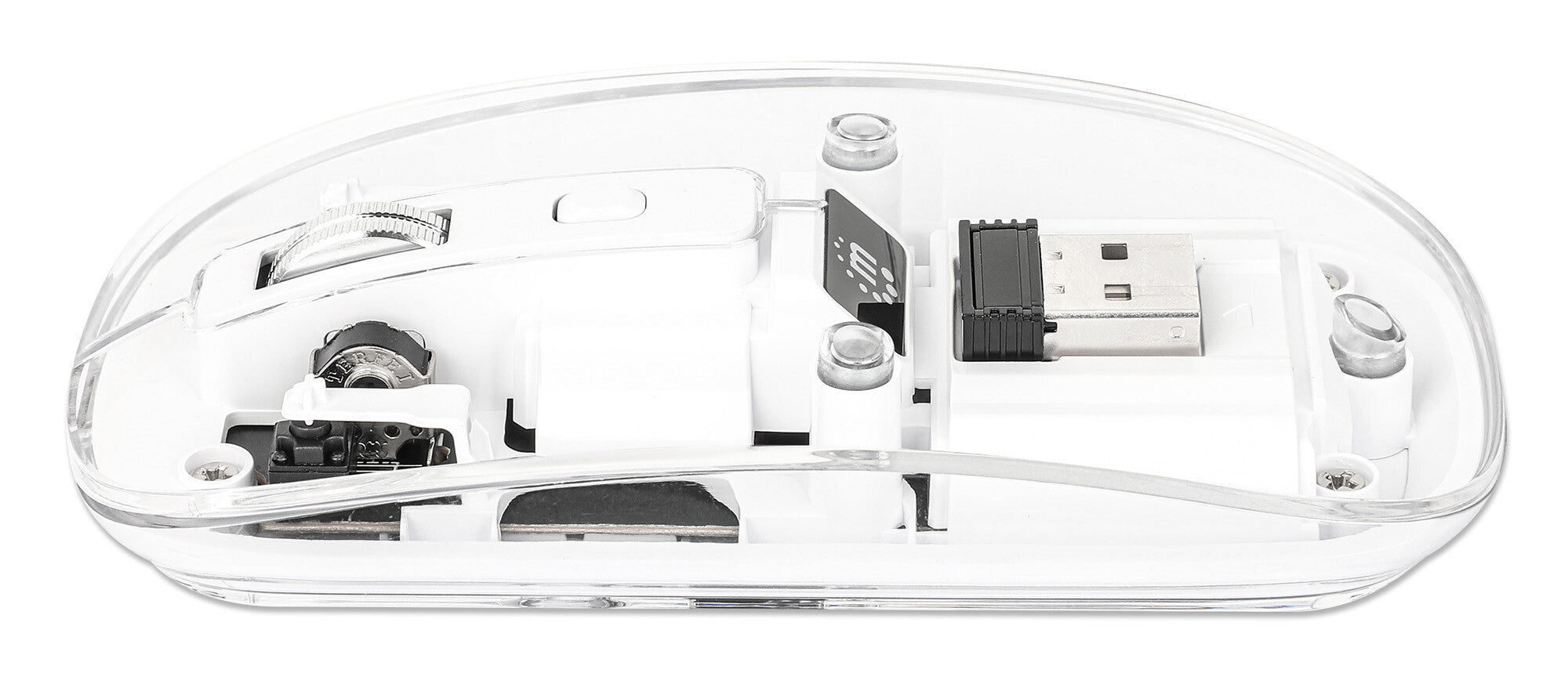 The Manhattan Transparent Wireless Optical USB Mouse is your attractive blend of style and functionality. Its transparent shell on a sleek silhouette showcases its components while the logo changes its colors in dynamic RGB light. The optical sensor immerses the mouse’s entire edge in a stylish red.
