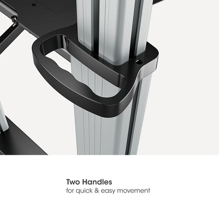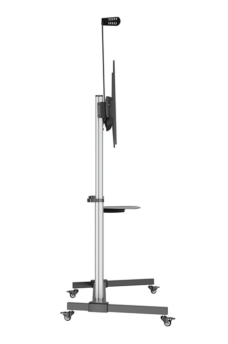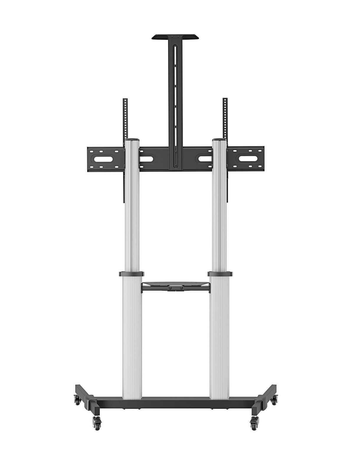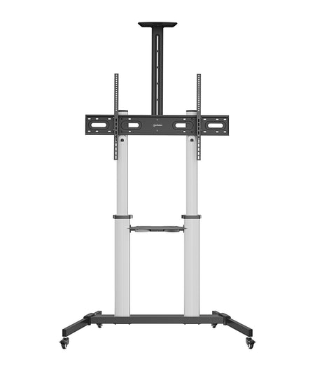 Bring the TV to you. When it needs to be somewhere else, move it there with ease. The Manhattan Aluminum Height-Adjustable Multimedia TV Cart puts the TV on wheels so you can take it to different spaces as needed, avoid an annoying glare, or overcome a restrictive furniture setup. VESA-compliant and constructed of quality aluminum materials, this well-made, rolling TV stand supports large TVs up to 100" and can support a total weight up to 80 kg (176 lbs.). This rolling TV cart has all the benefits of the above-the-floor wall-mount installation - elevated views, a more professional look, greater security for your TV, etc. - plus mobile flexibility and independence. It includes one large AV shelf to hold and connect a laptop, Blu-ray player or streaming device, and it includes a camera shelf for easy video conferencing. The locking heavy-duty steel casters let you swiftly move this TV cart between rooms. Their highly durable polyurethane tread easily absorbs bumps on the way. This rolling TV stand is ideal for residential, office, hospitality, classroom and conference room, and other commercial purposes. The optional height adjustment lets you put the display at the right level for your audience, so your message is seen and received.