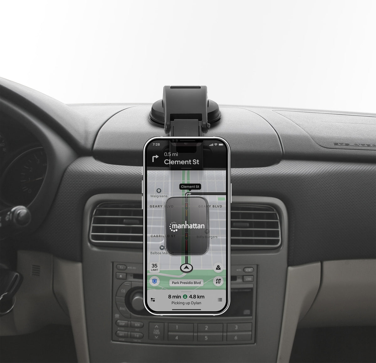 The Manhattan Car Dash Mount with Magnetic Phone Holder ensures the secure and convenient display of your smartphone even through the bumps and turns of the road. An adhesive suction cup firmly holds the mount on your dashboard.