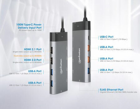 Increase your productivity with your PC, Mac® or tablet using this highly versatile docking station from Manhattan. It helps you multitask on two UHD HDMI monitors at the same time. You're also able to meet most connectivity needs with five SuperSpeed USB-A ports that connect and charge compatible devices fast, as well as a SuperSpeed USB-C data-transfer port to connect high-bandwidth devices. The included 10/100/1000 auto-sensing Ethernet port helps you onto your wired network, and the up-to-100-W Power Delivery (PD) input helps get power to all USB devices that connect to the dock.
