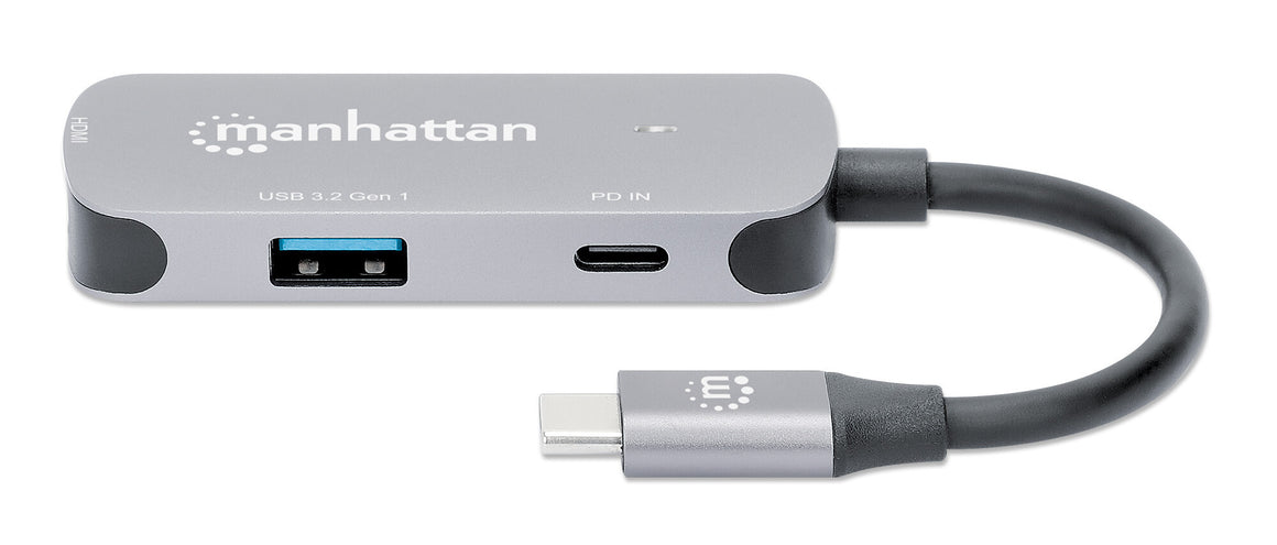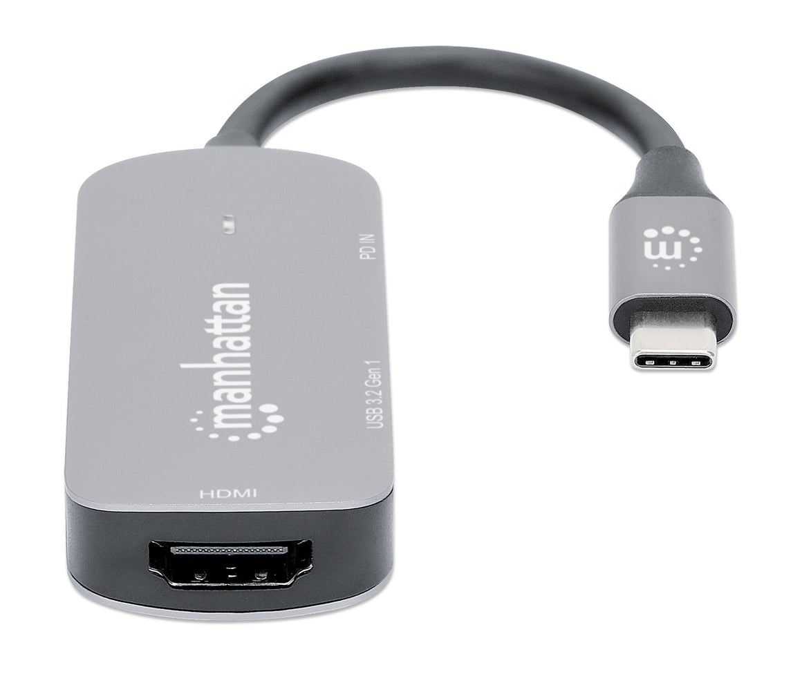The Manhattan USB-C 3-in-1 HDMI Docking Converter with Power Delivery establishes a fast, simple and convenient link between a newer USB Type-C equipped media source (a laptop, PC, MacBook®, Chromebook™, computer, tablet, etc.) and existing HDMI display (monitor, TV or projector) for 4K at 60 Hz images in either mirror- or extended-display mode. Create a mini-workstation by adding any USB 3.2 Gen 1 (formerly USB 3.0) peripheral such as a mouse, keyboard, hub, external memory device and more with the integrated USB-A port. This multiport Docking Converter is easy and quick to install. No complicated configuration or setup is required to enhance the functionality of your USB-C device. Its all-in-one design achieves a compact, integrated solution that eliminates unnecessary cables, tangles and clutter to keep installations and workspaces neat and orderly.