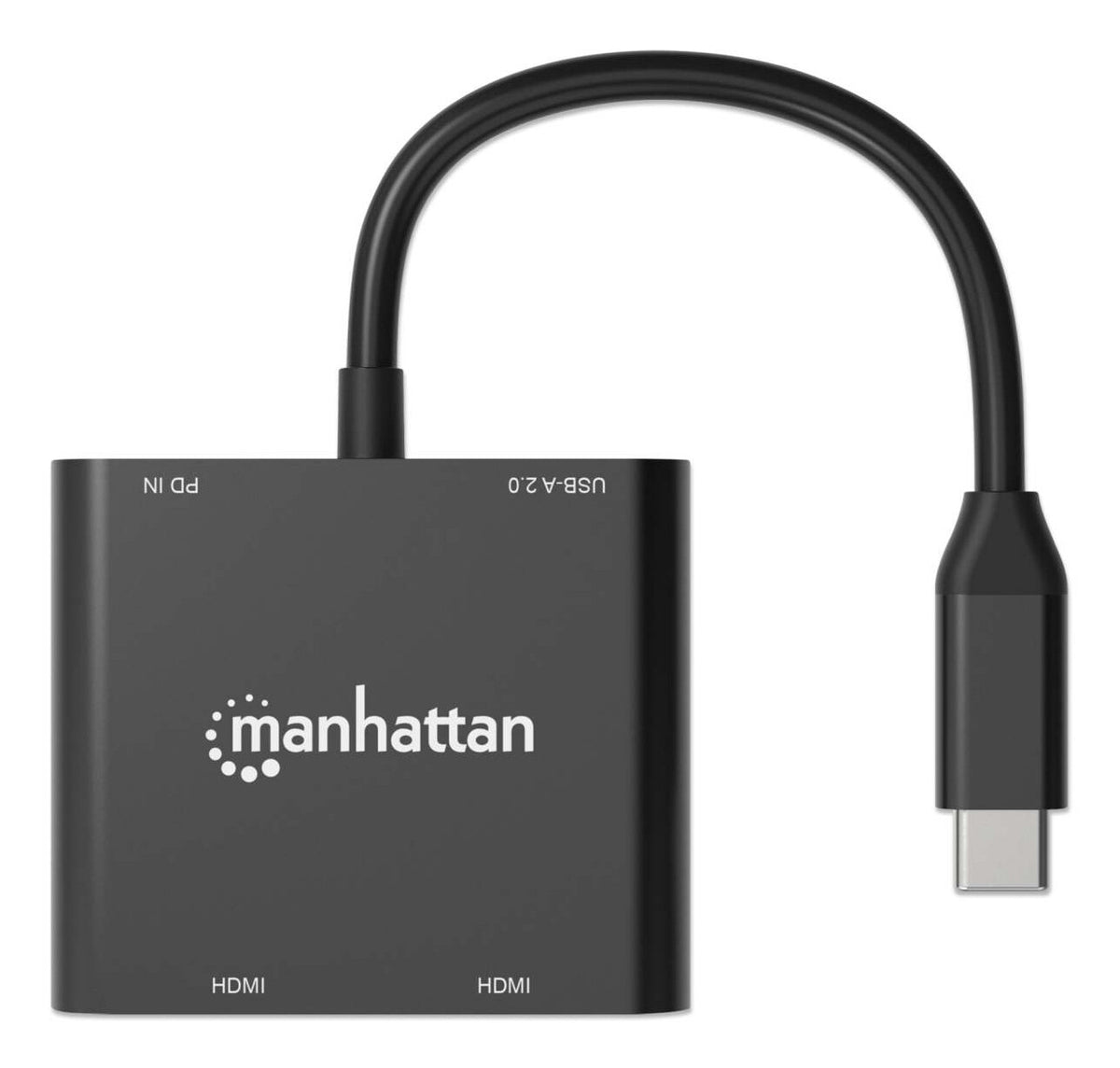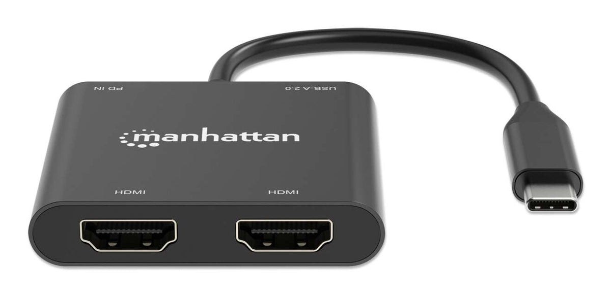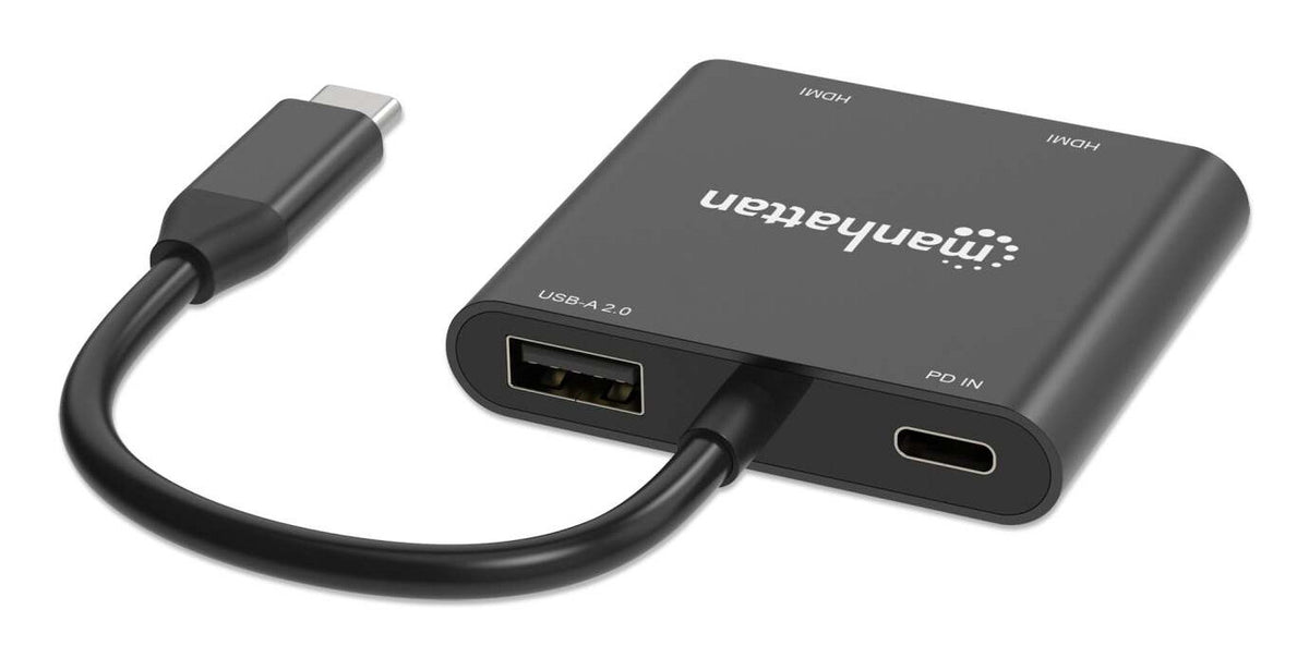Be more productive with the Manhattan USB-C PD to Dual-HDMI Monitor Adapter for Laptop and Tablet. This versatile adapter lets you connect your USB-C device to two HDMI displays while simultaneously charging it with up to 100 W, ensuring you stay powered up and ready for anything.