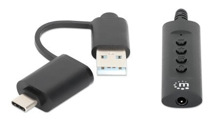 This active Manhattan USB Audio Adapter is a convenient 2-in-1 combo to connect your wired Aux device, such as a headset, headphones or speakers, to a USB device. Featuring a 3.5 mm audio jack on one end and two USB plugs on the other (Type-A and Type-C), it provides a versatile and affordable audio solution for your USB devices that do not have an aux input. Think of it as an external sound card, which means it can easily replace sound cards that no longer work and bypass damaged audio ports. As many desktop PCs have their headset jacks on the back and USB ports on the front, this will headphone jack adapter gives you better access to your audio connections.