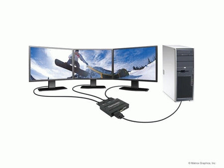 Matrox TripleHead2Go is an external multi-display upgrade that adds up to three monitors to your notebook or desktop computer. Ideal for professionals requiring more desktop space for maximum productivity increases and gamers wanting a totally immersive experience, this small box lets you run different applications on each display or view one application across up to three monitors. Available in DisplayPort, Digital, or Analog Editions.