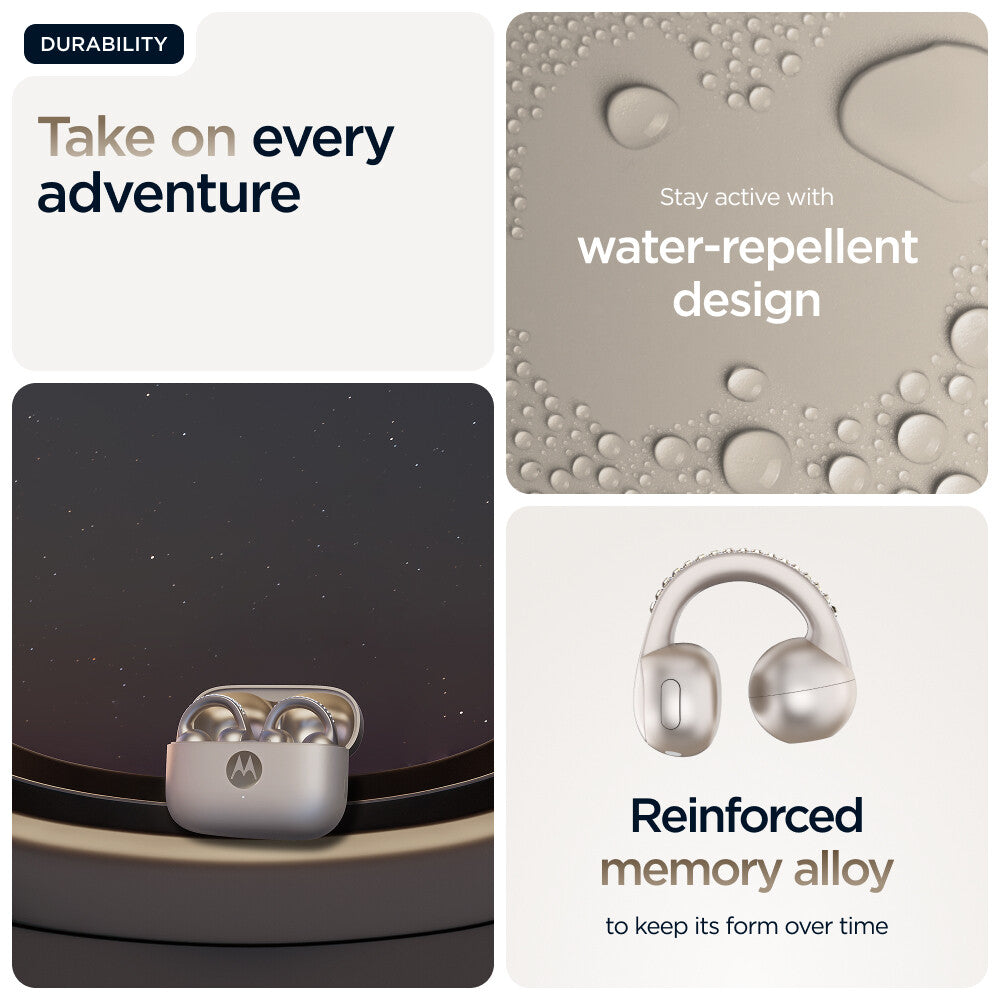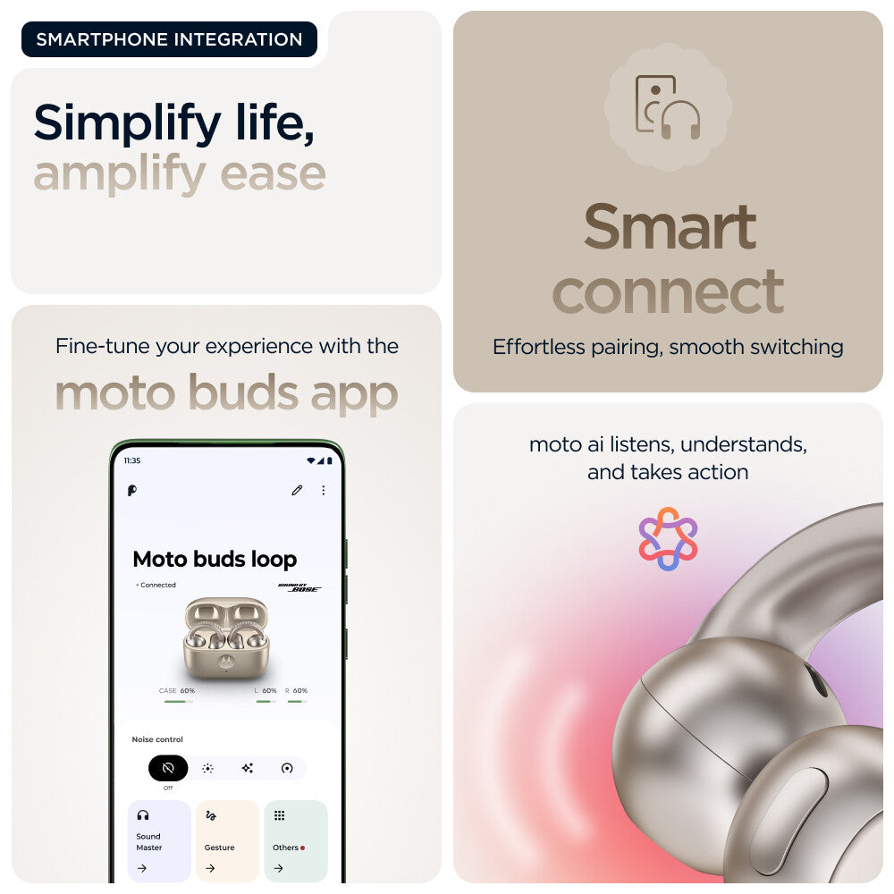 Introducing moto buds loop, sleek and lightweight earbuds designed to elevate your audio experience while keeping you connected to the world around you. With an open-ear design, moto buds loop delivers the aesthetic you want while providing the all-day comfort you crave. Stay in control of your busy day without missing a beat when paired with devices powered by moto ai.(1) Listen with unbelievable clarity and balance thanks to Sound by Bose. Experience crystal-clear calls with an advanced microphone system. And keep it all protected thanks to premium materials and a water-repellent design.(2) With up to 8 hours of nonstop battery(3) and plenty more in the case, you have all the power you need. moto buds loop is always in tune with you.