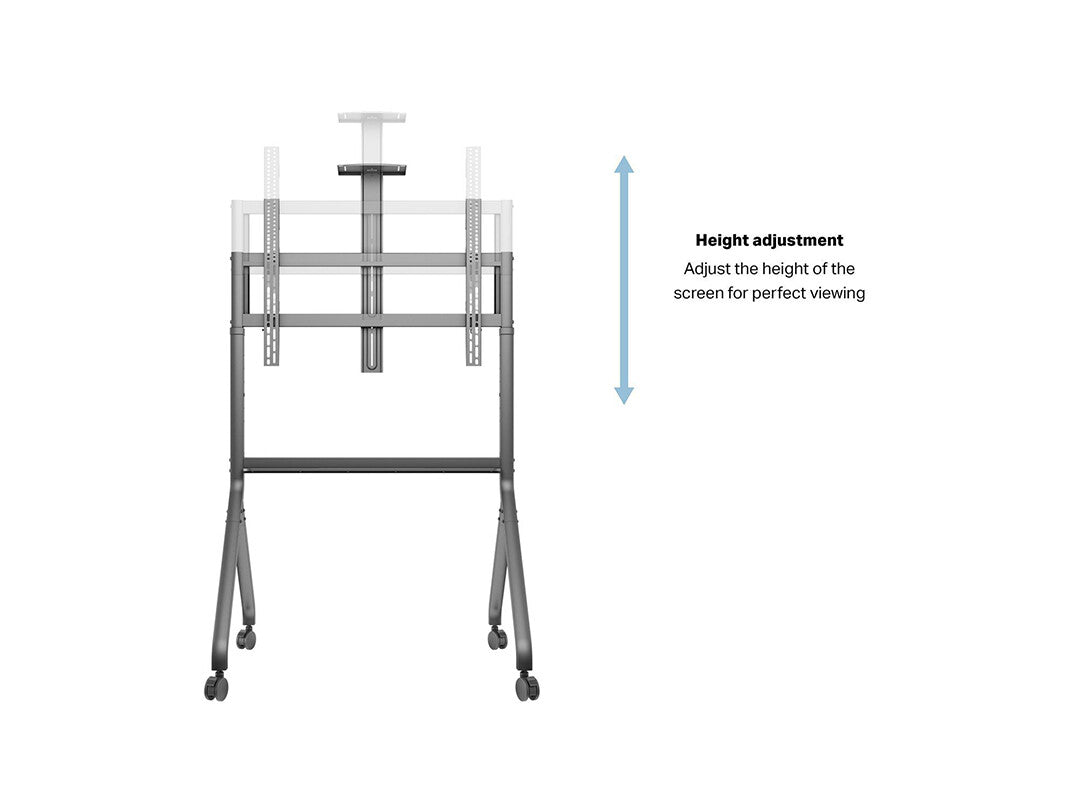 Easy screen height- adjustment, and mobility mean that an optimal viewing position can always be achieved for any presentation, digital -signage or video-conference situation. The heavy -duty castors feature a safety- brake, ensuring the stand cannot roll out of position, whilst the cable- management system ensures a tidy and professional look.