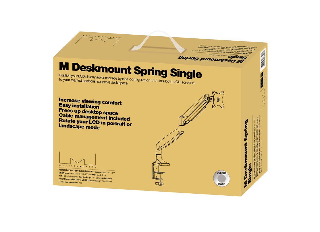 Finally comfort and ergonomics and economy is possible to achieve. With The M Deskmount Spring Single you can easily set the screen to your specific work position. By doing so you save back, neck and eyes. The M Deskmount Spring Single is your new office partner giving greater flexibility. M Deskmount Spring Single is well-functioning with almost all standard LCD monitors on the market supporting VESA standards of 75/100mm holding screen weight from 1 kg up to 9 kg