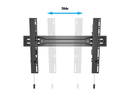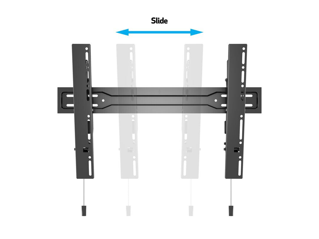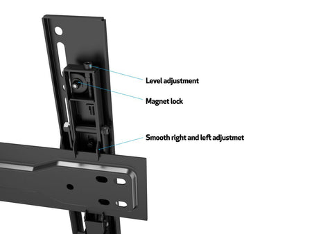 Several steps ahead. The M VESA Wallmount Super Slim Tilt 600 MAX series offers versatile installation features and mounting options. Horizontal and vertical adjustment abilities allow for post installation leveling and lateral shifting (move the screen from side to side after it is in place) making it easier than ever to find the perfect TV position. Lock the tilt angle at installation to prevent tampering or moving. The slim wall plate design offers good wall access, increasing the electrical and cable management options. The wall mount was made to be installed by a single person with simple brackets that hook onto the wall plate for an overall quick, simple, and secure installation.