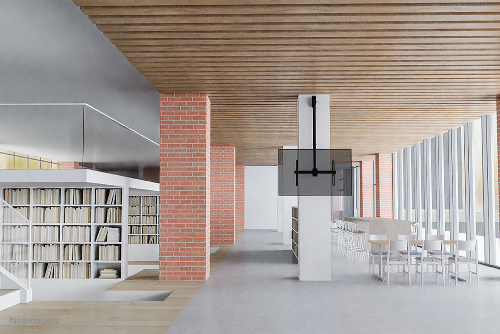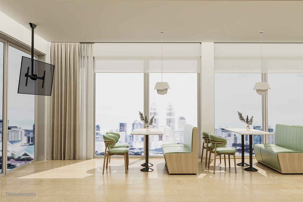 The Neomounts CL35-440BL16L is a full motion ceiling mount for flat screens up to 70". The unique tilt (25°) and swivel (360°) technology allows the mount to change to the optimal viewing angle. Level adjustment is available for the perfect installation.