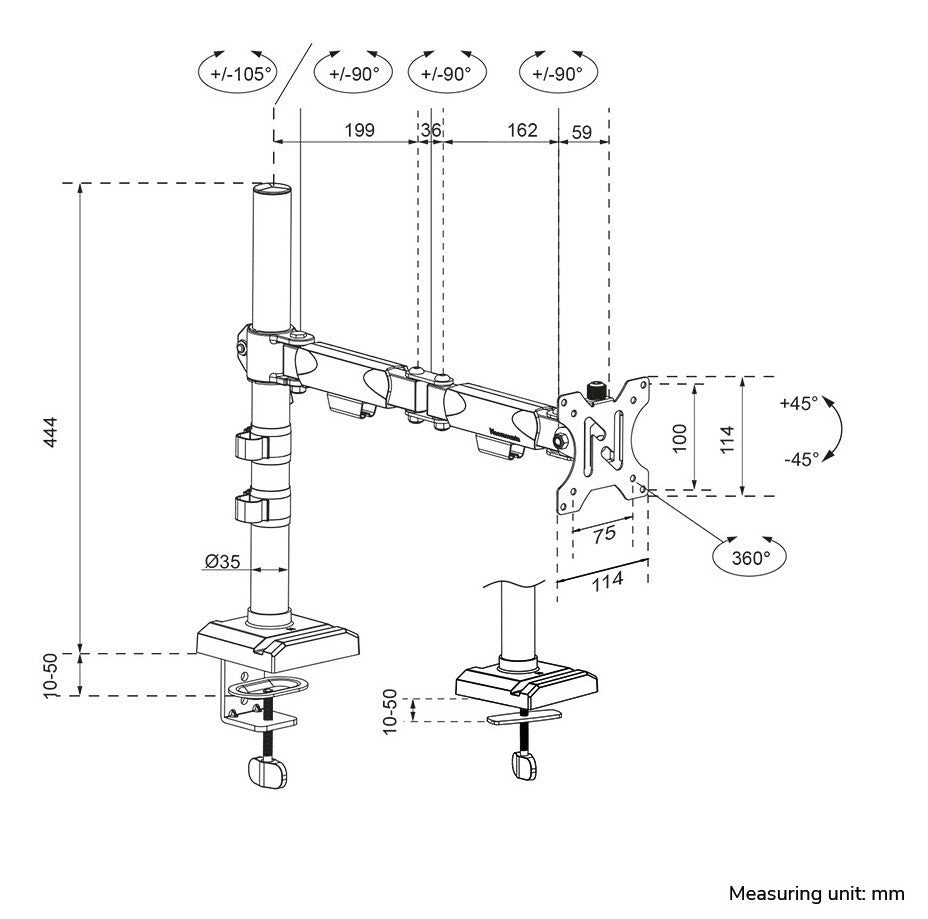 The NERO monitor arm features manual height and depth adjustment, allowing you to adjust your workspace completely to your liking. In addition, the clever 180° stop mechanism prevents the mount from making contact with the wall or separation panel when installed near it. The welded base guarantees optimal stability and sturdiness. The practical cable management system ensures neat routing of cables. In addition, the base of the DS60-600BL1 provides a convenient space to place a phone, for a tidy desk.