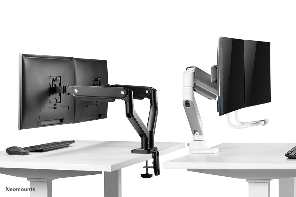 The Neomounts DS75-450WH2 NEXT Core is a full motion desk mount for two flat screens up to 32" with a maximum weight capacity of 8 kg per screen. The versatile tilt (20°), rotate (360°) and swivel (20°) technology allows the mount to change to any viewing angle to fully benefit from the capabilities of the screens. Additionally, the mount has gas spring height adjustment (27,7-56 cm) and depth adjustment (0-50,5 cm), to create the perfect working position.