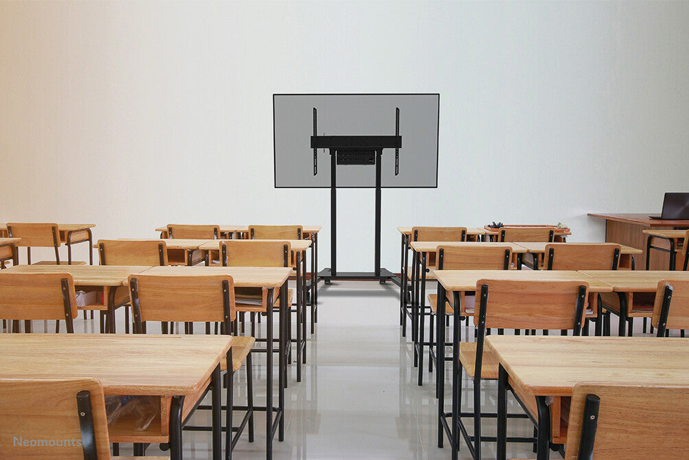 The Neomounts FL55-875BL1 MOVE Lift is a mobile floor stand for displays up to 100" with a maximum weight capacity of 110 kg. The trolley has 65 cm motorized height adjustment (35 mm/second), is operated with a wired remote control and features an anti-collision system for extra safety. A lockable, ventilated hardware compartment with cable opening is included and optional for installation.