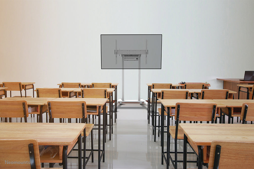 The Neomounts FL55-875WH1 MOVE Lift is a mobile floor stand for displays up to 100" with a maximum weight capacity of 110 kg. The trolley has 65 cm motorized height adjustment (35 mm/second), is operated with a wired remote control and features an anti-collision system for extra safety. A lockable, ventilated hardware compartment with cable opening is included and optional for installation.