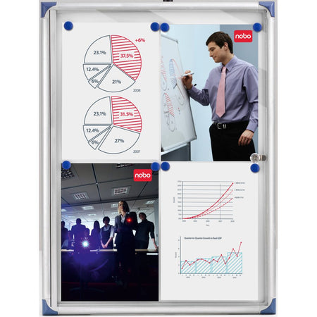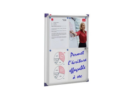 Slimline extra flat lockable glazed case for internal use. Ideal in corridors and where space is at a premium. White drywipe surface for writing and display of documents using magnets. Designed for secure display of 6xA4 documents. Supplied with wall fixings. 680x730x22mm