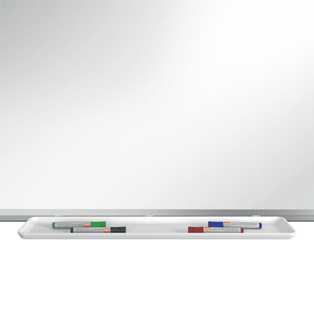 Melamine non magnetic whiteboard with a modern stylish aluminum trim. Fixed by a through corner wall mounting and includes a large whiteboard pen tray for the convenient storage of whiteboard markers and erasers. The melamine whiteboard surface delivers a good level of erasability for light use.