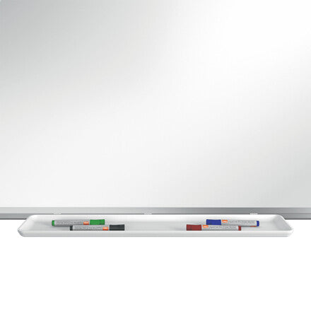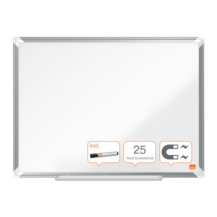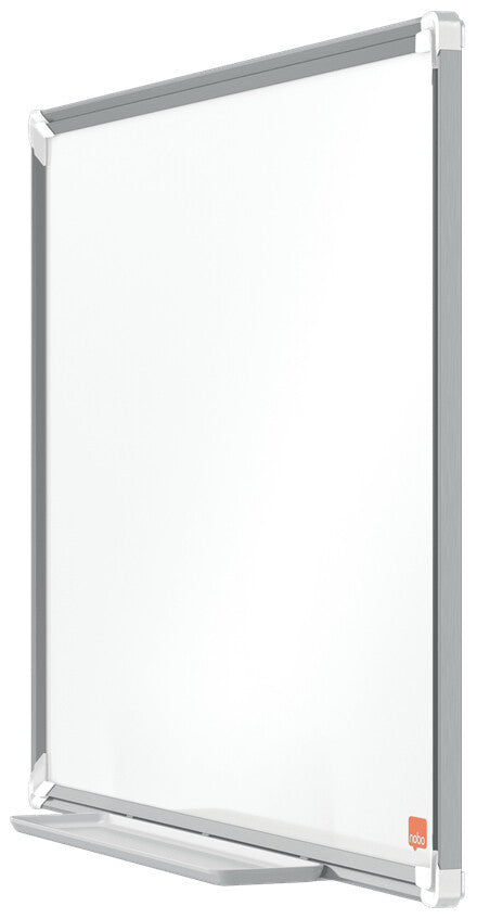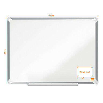 This modern standard magnetic whiteboard, with its sleek aluminium trim and stylish corner caps, is the perfect addition to any office, school, or home workspace. Its durable enamel surface offers superior erasability, resisting ghosting, scratches, and dents, making it ideal for frequent use. This small whiteboard has a smooth surface that enhances writing, ensuring clear, bold and stand out communication for effective collaboration. Designed with a concealed traditional through corner-mount system, it can be easily installed in either landscape or portrait orientation. The wall mounted whiteboard is magnetic, allowing for easy attachment of notes, photos, and key information and includes a large clip on accessories tray for the storage of whiteboard pens and whiteboard magnets. Our Premium Plus Whiteboards proudly carry the globally respected EU Ecolabel, recognising environmental excellence and ensuring reduced impact throughout the product life cycle. Whiteboard size: 600x450mm