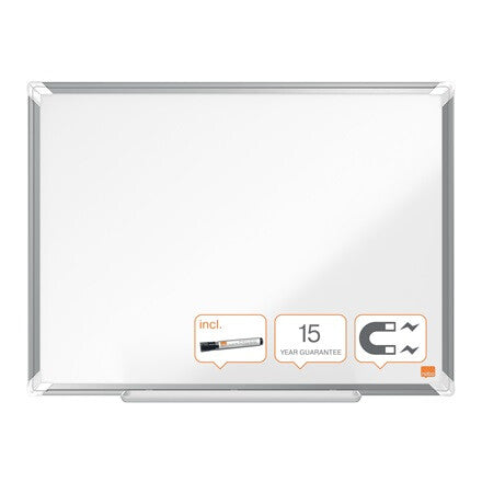 This modern standard magnetic whiteboard, with its sleek aluminium trim and stylish corner caps, is the perfect addition to any office, school, or home workspace. Its painted steel surface offers increased erasability which is less prone to ghost marks, stains and resistant to scratches and dents, making it ideal for moderate use. This small whiteboard has a smooth surface that enhances writing, ensuring clear, bold and stand out communication for effective collaboration. Designed with a concealed traditional through corner-mount system, it can be easily installed in either landscape or portrait orientation. The wall mounted whiteboard is magnetic, allowing for easy attachment of notes, photos, and key information and includes a large clip on accessories tray for the storage of whiteboard pens and whiteboard magnets. Our Premium Plus Whiteboards proudly carry the globally respected EU Ecolabel, recognising environmental excellence and ensuring reduced impact throughout the product life cycle. Whiteboard size: 600x450mm