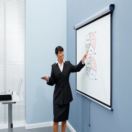 The brilliant matt white surface of this screen provides a sharp, detailed image that can be easily viewed by everyone in the audience. The screen can be easily retracted into its housing to protect from damage or to store when not in use. With the optional extension brackets, the screen can be mounted over a whiteboard or tilted towards the audience. 2400x1813mm.