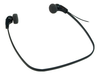 Lightweight under-the-chin style stereo headphones designed to deliver excellent sound quality, with soft ear cushions for wearing comfort, and a hanging bracket that attaches the headset to a monitor.