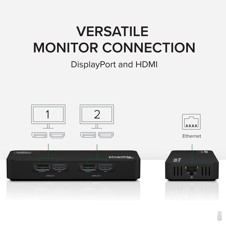 | Packaging content | 1x Plugable USB 3.0 and USB-C 4K DisplayPort and HDMI Dual Monitor Adapter with Ethernet1x USB-C to USB-A Adapter1x Quick Start Guide |
