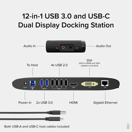 - Flexible Expandability—A single included USB 3.0 or USB-C cable from your laptop to this dock provides dual video outputs, wired Gigabit Ethernet, 3.5mm Headphone and Microphone jacks, two USB 3.0 ports, and four USB 2.0 ports