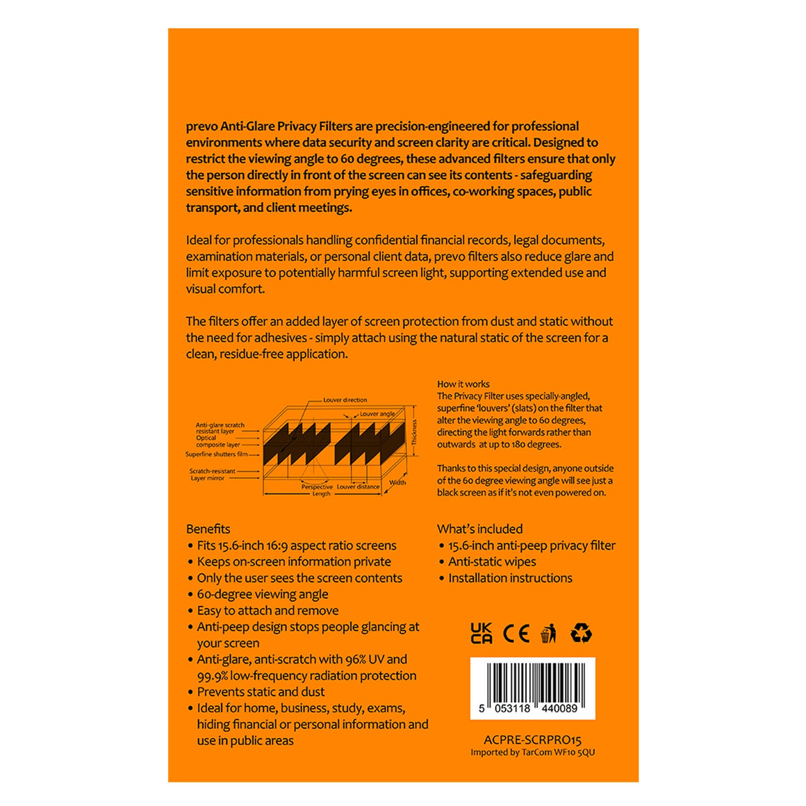 prevo Anti-Glare Privacy Filters are precision-engineered for professional environments where data security and screen clarity are critical. Designed to restrict the viewing angle to 60 degrees, these advanced filters ensure that only the person directly in front of the screen can see its contents - safeguarding sensitive information from prying eyes in offices, co-working spaces, public transport, and client meetings.