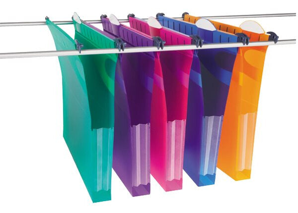 Bright, tough polypropylene A4 suspension files, for use in suspension filing drawers and cabinets. These durable files typically last 5 x longer than manilla. Wide capacity 30mm base to hold up to 300 sheets of A4 80gsm paper. Additional expanding polypropylene protective side wall to keep documents secure. Easy-glide plastic bars with unique linking mechanism to clip files together to avoid document misfiling. Multi-positionable plastic tabs with white sticker labels. Designed for rails 330mm apart. Files are 240mm deep. Supplied as Pack of 10 assorted bright colours, 2 of each: green, Blue, Pink, Purple, Orange.