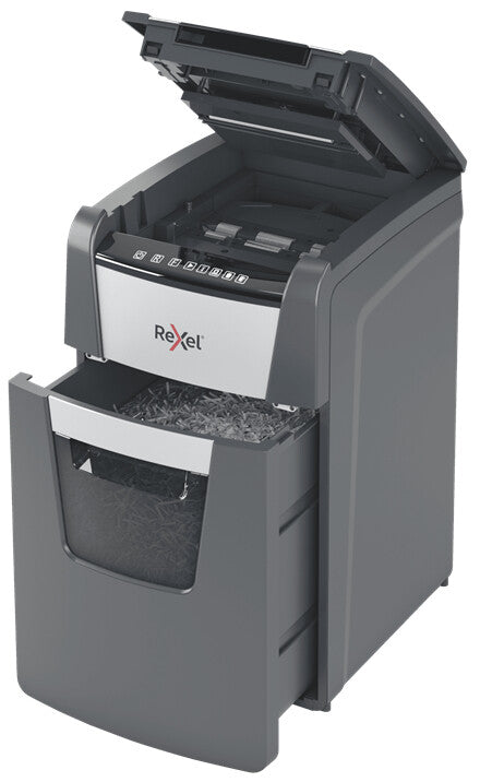 The Optimum AutoFeed+ 150M micro cut shredder automatically shreds up to 150x A4 sheets of paper (80gsm) at a time, into P-5 (2x15mm) micro cut pieces. This auto feed shredder machine is a sophisticated office shredder, featuring a 44L pull out bin. No need to manually feed paper, or remove staples and paper clips first, this automatic paper shredder will do all the work for you.