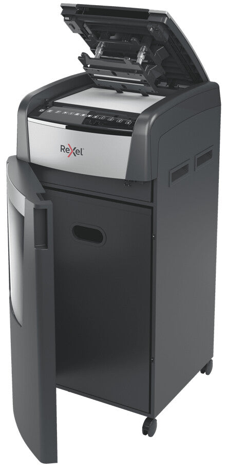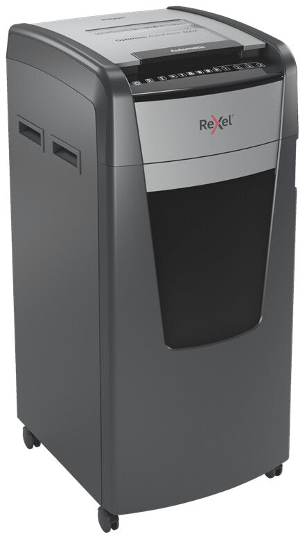 The Optimum AutoFeed+ 600X cross cut shredder automatically shreds up to 600x A4 sheets of paper (80gsm) at a time, into P-4 (4x36mm) cross cut pieces. This auto feed shredder machine is a sophisticated office shredder, featuring a 110L pull out bin. No need to manually feed paper, or remove staples and paper clips first, this automatic paper shredder will do all the work for you.