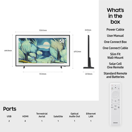 Brand-specific features | Modern Frame Design & Bezel*, Pantone Validated Colour, with Real Quantum Dots, Matte Display, Art Mode, Dolby Atmos®*, One Connect Box, NQ4 AI Gen2 Processor, Art Store, Slim Fit Wall-Mount In-Box, Customisable Bezels*, Adaptive Sensors (Brightness & Motion), 4K AI Upscaling, Quantum HDR, My Photo, Art Store Streams, Object Tracking Sound*, AI Sound Pro, Matte Canvas, Gaming Hub, Smart TV powered by Tizen OS*, Samsung TV Plus, Auto HDR Remastering, AI Customisation Mode, Colour Booster Pro, Real Depth Enhancer, Dual LED, Motion Xcelerator 144Hz, Samsung Q-Symphony, Samsung Knox Security, Game Bar, SolarCell Remote, SmartThings, 10 Year Screen Burn Warranty, Height Adjustable Stand, Multiple Voice Assistants, Mobile Mirroring, Generative Wallpaper, Multi View, SmartThings Calibration, Samsung Health*, FreeSync Premium*, Auto Game Mode (ALLM) |
