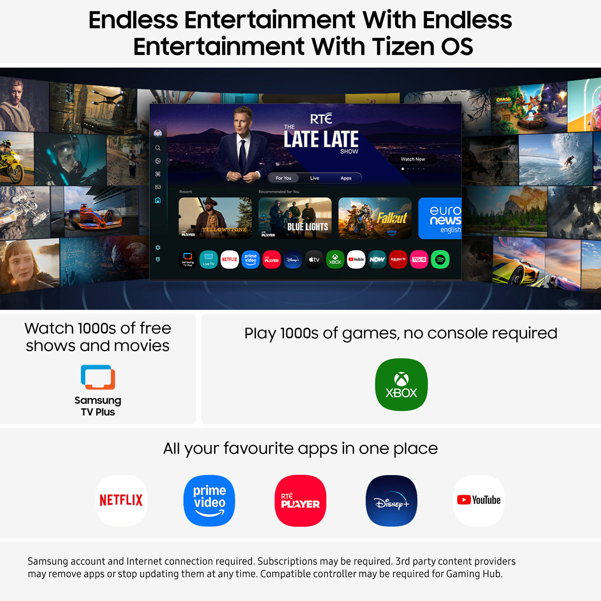 Samsung Gaming Hub brings together the biggest console and streaming games from Xbox and other industry-leading partners, all in on one place[1] With no downloads, storage limits or console required, just turn on your TV and play.