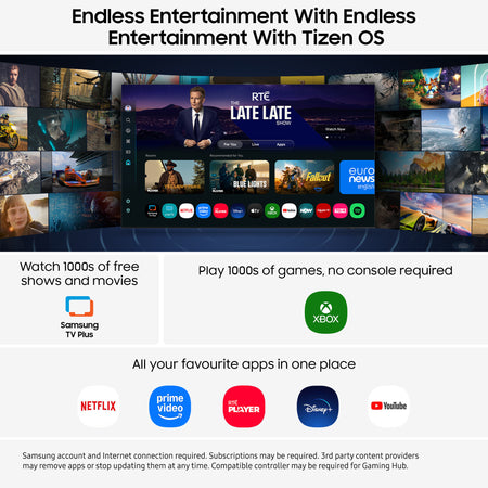 Spend less time searching and more time watching. With BBC iPlayer, Netflix, Disney+, YouTube, Xbox and more, get personalised recommendations and instant access to the latest shows and movies on the best streaming apps. Plus access to 1,000s of extra TV Shows and Movies on Samsung TV Plus - all for free.