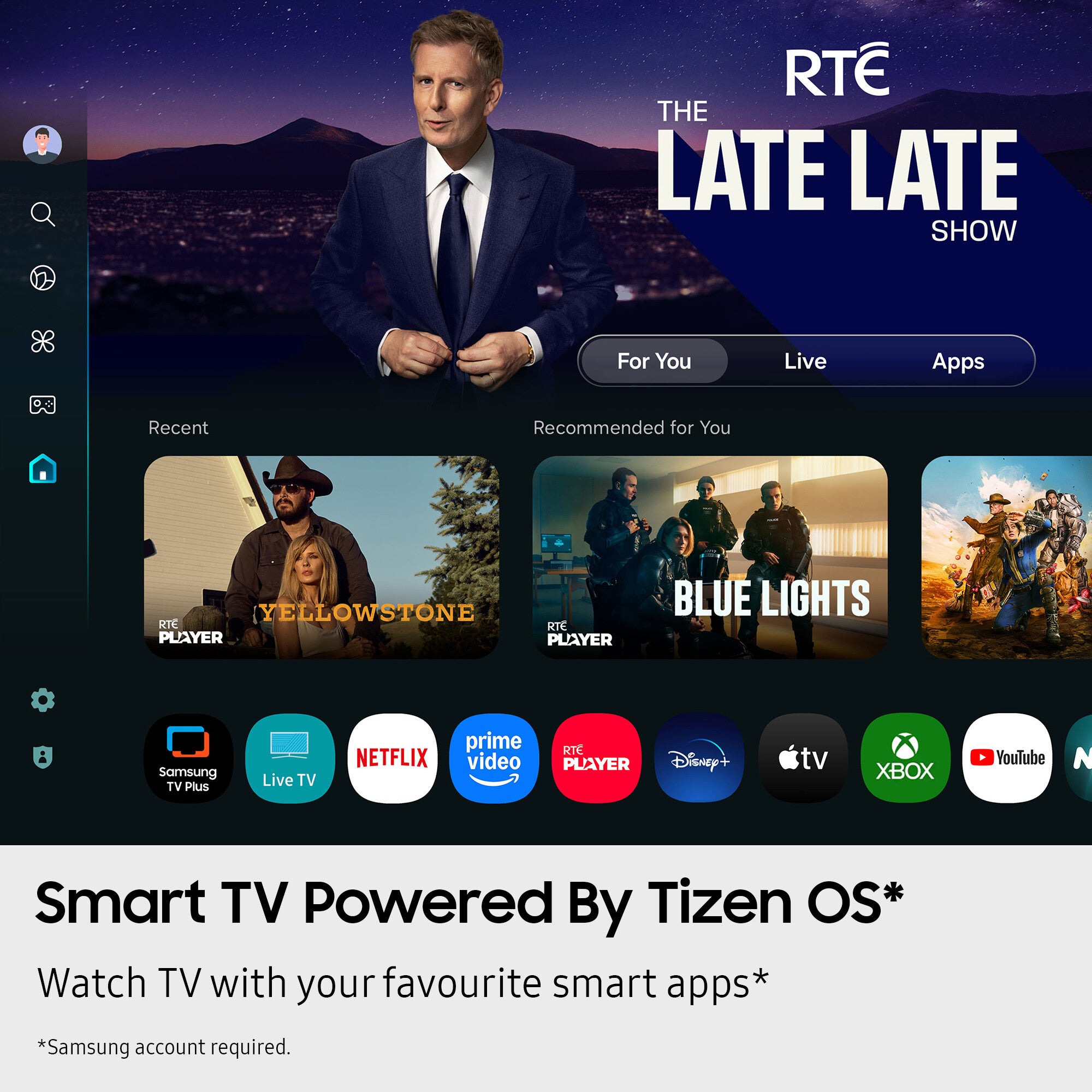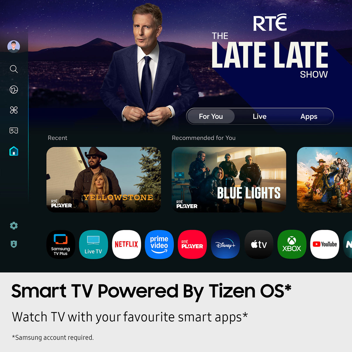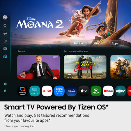 Spend less time searching and more time watching. With BBC iPlayer, Netflix, Disney+, YouTube, Xbox and more, get personalised recommendations and instant access to the latest shows and movies on the best streaming apps. Plus access to 1,000s of extra TV Shows and Movies on Samsung TV Plus - all for free.