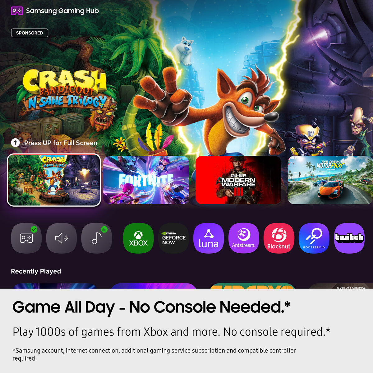 Samsung Gaming Hub brings together the biggest console and streaming games from Xbox and other industry-leading partners, all in on one place[1] With no downloads, storage limits or console required, just turn on your TV and play.