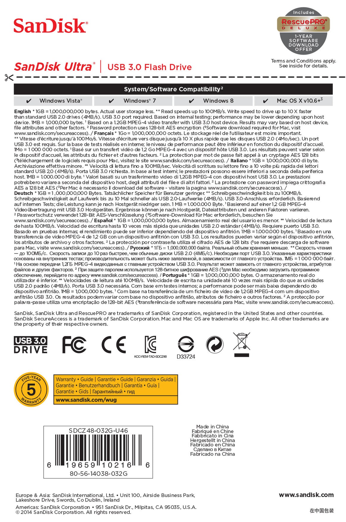 The SanDisk Ultra USB 3.0 Flash Drive is backed by a five-year limited warranty.