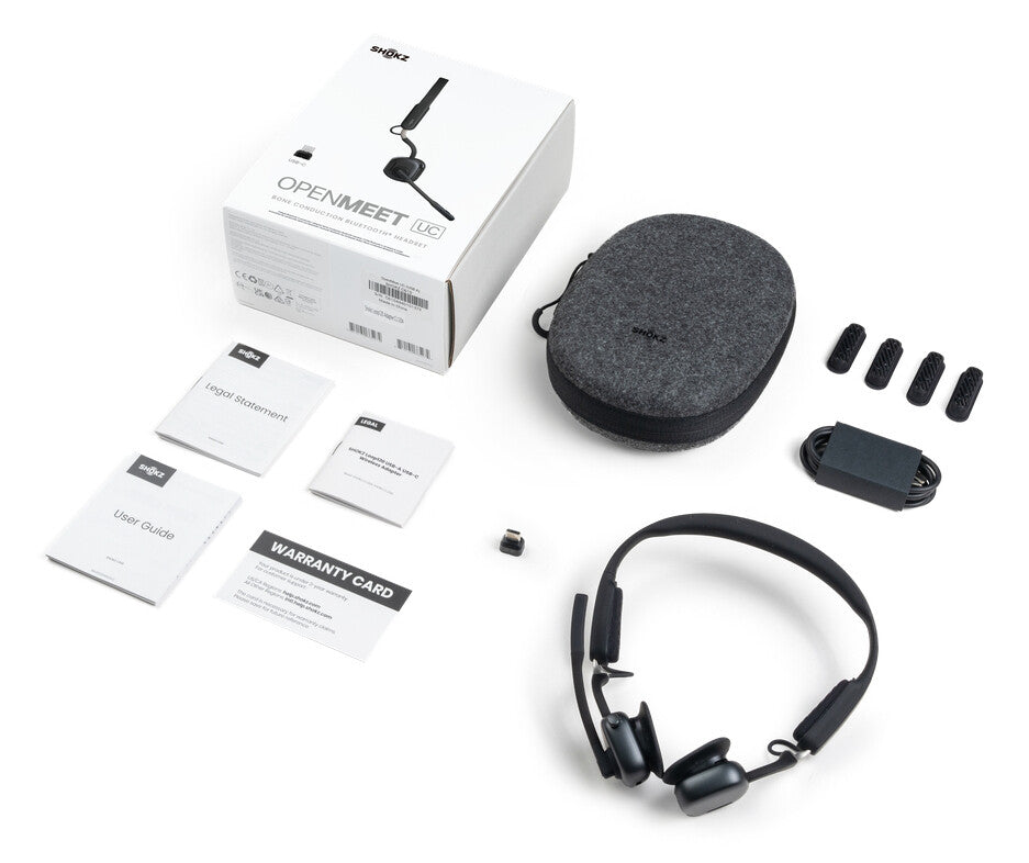 1 x Headset, 1 x Hard Case, 1 x USB2.0 CM-CM Data Cable, 1 x Manual, 1 x Legal Statement, 1 x Warranty Card, 2 x Pairs of Cushions, 1 x Shokz Loop120 (USB C adapter) |