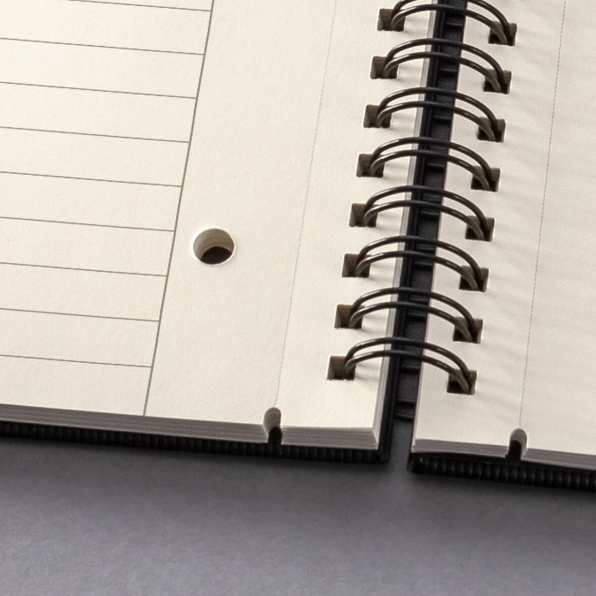 - Sturdy metal double spiral, the cover folds back completely, 4-hole punching, space for the date at the top