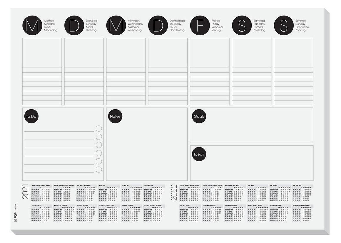 This paper desk pad with its practical weekly planner is the ideal way to get organised while at your desk. In addition to the seven-day schedule, the practical A3 format provides plenty of space for notes, personal goals and spontaneous ideas. The "to do list" feature is particularly satisfying, as each task can be ticked off once completed. The paper desk pad comes in a stylish black and white design. The weekdays are printed in a simple yet elegant font along the top of the page, clearly listed in German, English, French and Dutch. The paper desk pad comprises 30 sheets, 42 cm x 29.7 cm in size. Gluing along the bottom edge and partial gluing on the top corners helps prevent ugly dog-eared corners.