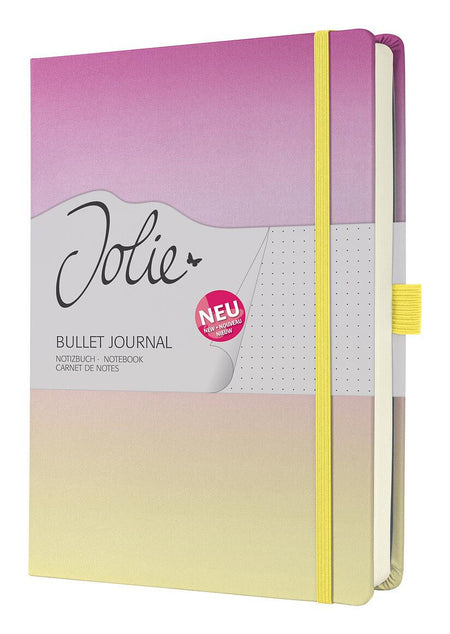 Become an expert in hand lettering - with this special Jolie Bullet Journal Gradient Ice-Cream in the A5+ format (17 x 22 x 2,40 cm) with 200 pages (120 gsm, all pages are numbered). The sturdy hardcover jacket in pink/yellow guarantees a firm surface for writing and drawing. Give free rein to your creativity. With its extra-thick, ivory-coloured paper, the Jolie bullet journal is ideal for creative trends such as hand lettering and bullet journaling, and can be embellished with ornate lettering and drawings. At home on the sofa, during your lunch break or on your morning commute: the sturdy hardcover notebook can be opened 180° to lie completely flat, allowing the whole page to be written on, right to the centre fold. Thanks to the pen loop, the perfect pen is always on hand. The jacket, covered with matt coated fabric, is a real eye-catcher with its cheery colour gradient in watercolour style. The notebook has a colour-coordinated elastic fastener and numbered pages, and also comes equipped with three bookmarks in different colours and an insert pocket. This beautiful designer notebook for creative people is also the perfect gift for colleagues, friends and family.