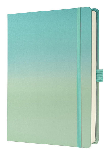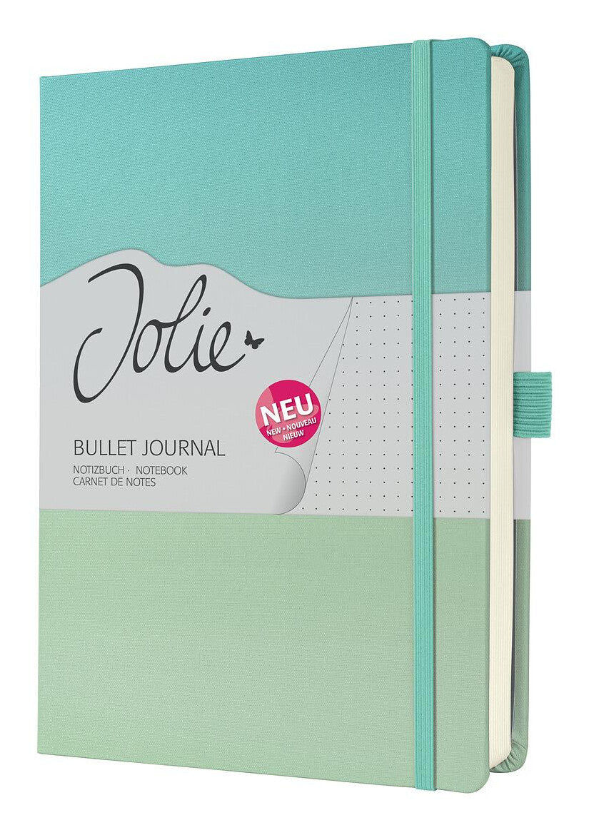 Become an expert in hand lettering - with this special Jolie Bullet Journal Gradient Sea in the A5+ format (17 x 22 x 2,40 cm) with 200 pages (120 gsm, all pages are numbered). The sturdy hardcover jacket in turquoise/mint green guarantees a firm surface for writing and drawing. Give free rein to your creativity. With its extra-thick, ivory-coloured paper, the Jolie bullet journal is ideal for creative trends such as hand lettering and bullet journaling, and can be embellished with ornate lettering and drawings. At home on the sofa, during your lunch break or on your morning commute: the sturdy hardcover notebook can be opened 180° to lie completely flat, allowing the whole page to be written on, right to the centre fold. Thanks to the pen loop, the perfect pen is always on hand. The jacket, covered with matt coated fabric, is a real eye-catcher with its cheery colour gradient in watercolour style. The notebook has a colour-coordinated elastic fastener and numbered pages, and also comes equipped with three bookmarks in different colours and an insert pocket. This beautiful designer notebook for creative people is also the perfect gift for colleagues, friends and family.