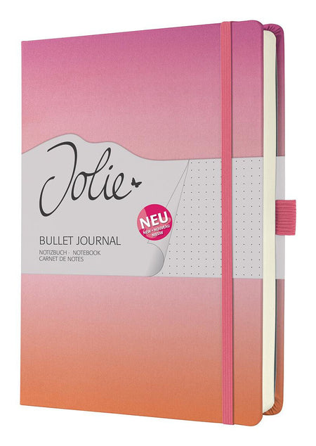 Become an expert in hand lettering - with this special Jolie Bullet Journal Gradient Sunset in the A5+ format (17 x 22 x 2,40 cm) with 200 pages (120 gsm, all pages are numbered). The sturdy hardcover jacket in pink/pink/orange guarantees a firm surface for writing and drawing. Give free rein to your creativity. With its extra-thick, ivory-coloured paper, the Jolie bullet journal is ideal for creative trends such as hand lettering and bullet journaling, and can be embellished with ornate lettering and drawings. At home on the sofa, during your lunch break or on your morning commute: the sturdy hardcover notebook can be opened 180° to lie completely flat, allowing the whole page to be written on, right to the centre fold. Thanks to the pen loop, the perfect pen is always on hand. The jacket, covered with matt coated fabric, is a real eye-catcher with its cheery colour gradient in watercolour style. The notebook has a colour-coordinated elastic fastener and numbered pages, and also comes equipped with three bookmarks in different colours and an insert pocket. This beautiful designer notebook for creative people is also the perfect gift for colleagues, friends and family.